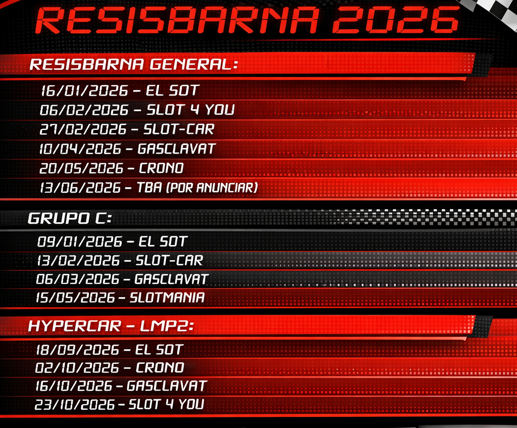 | El sot 16/01/2026 Slot for you 06/02/2026 Slot car 27/02/2026 Gasclavat 13/03/2026 Crono 10/04/2026 Slotmania 22/05/2026 Pendiente de anunciar 13/06/2026 | El sot 09/01/2026 Slot car 13/02/2026 Gasclavat 06/03/2026 Slotmania 15/05/2026 | El sot 18/09/2026 Gasclavat 02/10/2026 Crono 16/10/2026 Slot for you 23/10/2026 |